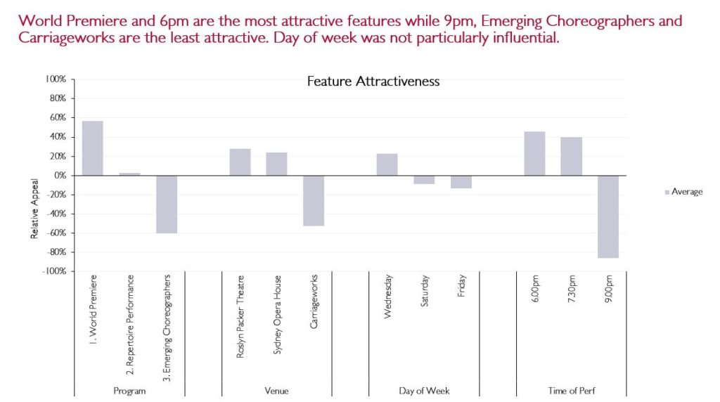 Program was also important with strong preference for World Premiere, which was just over 50% more attractive than Repertoire Performance, which in turn was about 60% more attractive than Emerging Choreographers